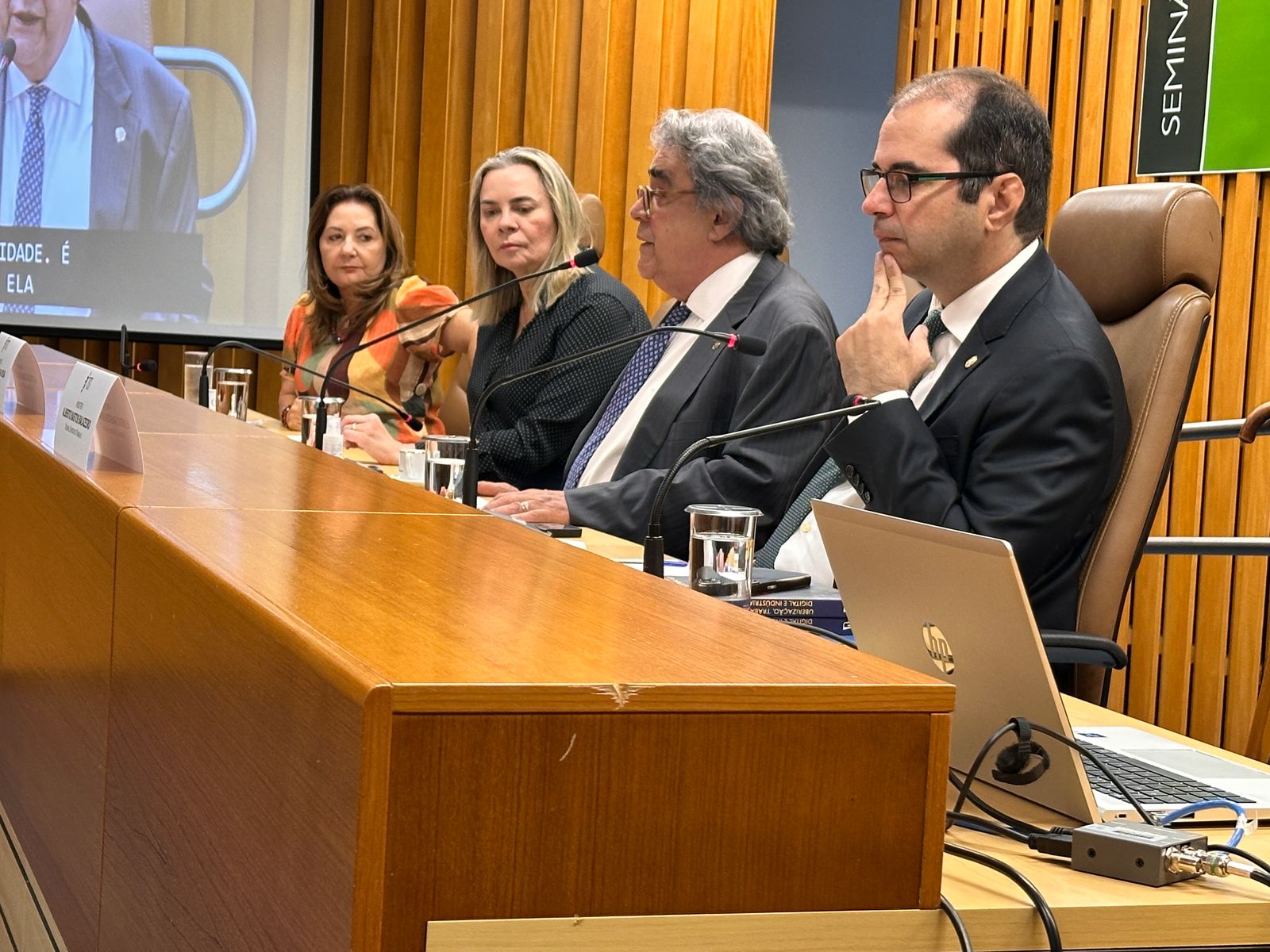 Compuseram a mesa de abertura o presidente do TST, ministro Aloísio Corrêa da Veiga, a ministra do TST e diretora da Enamat, Kátia Magalhães Arruda, o ministro do TST e coordenador do Programa Trabalho Seguro, Alberto Bastos Balazeiro, e a vice coordenadora do Programa, ministra Liana Chaib.